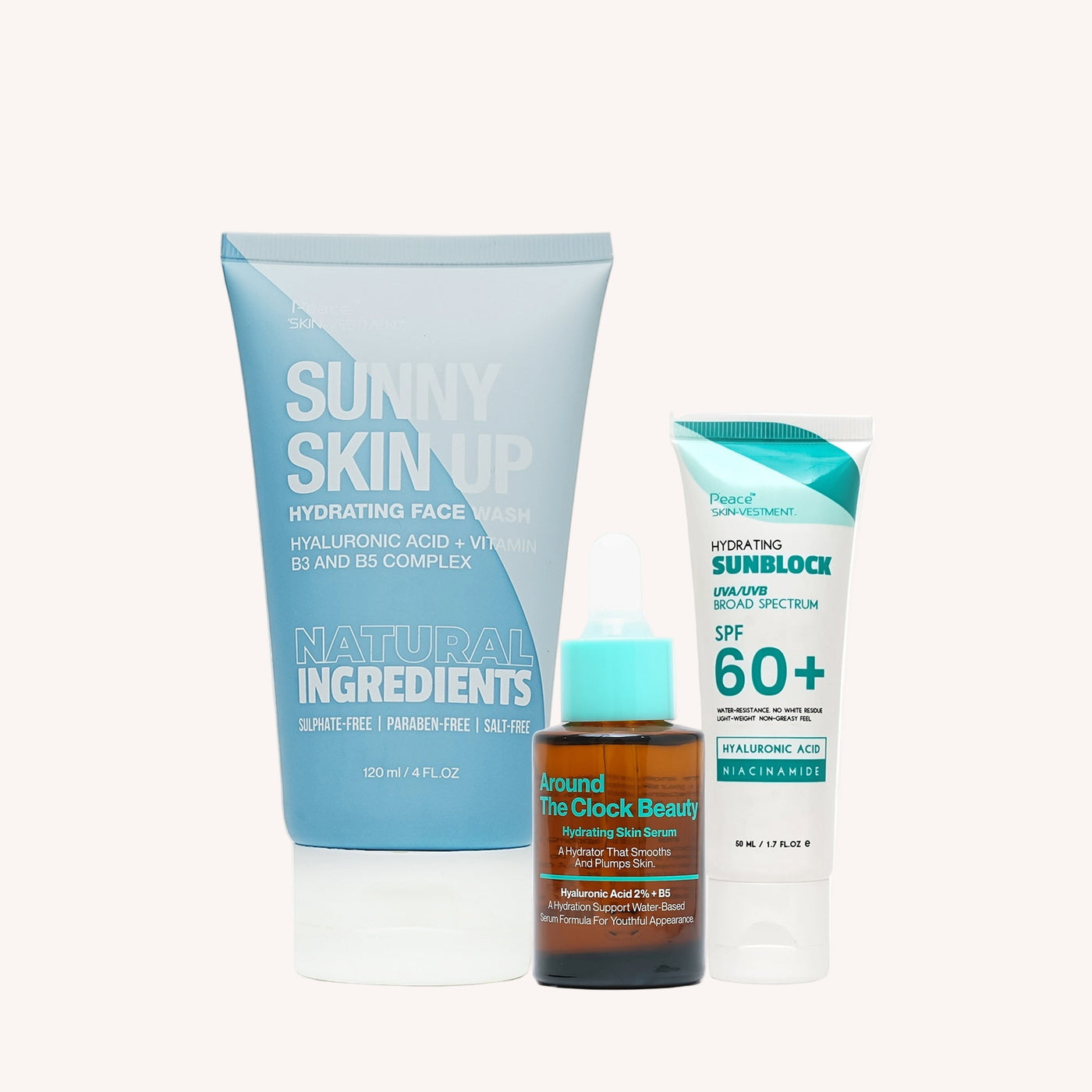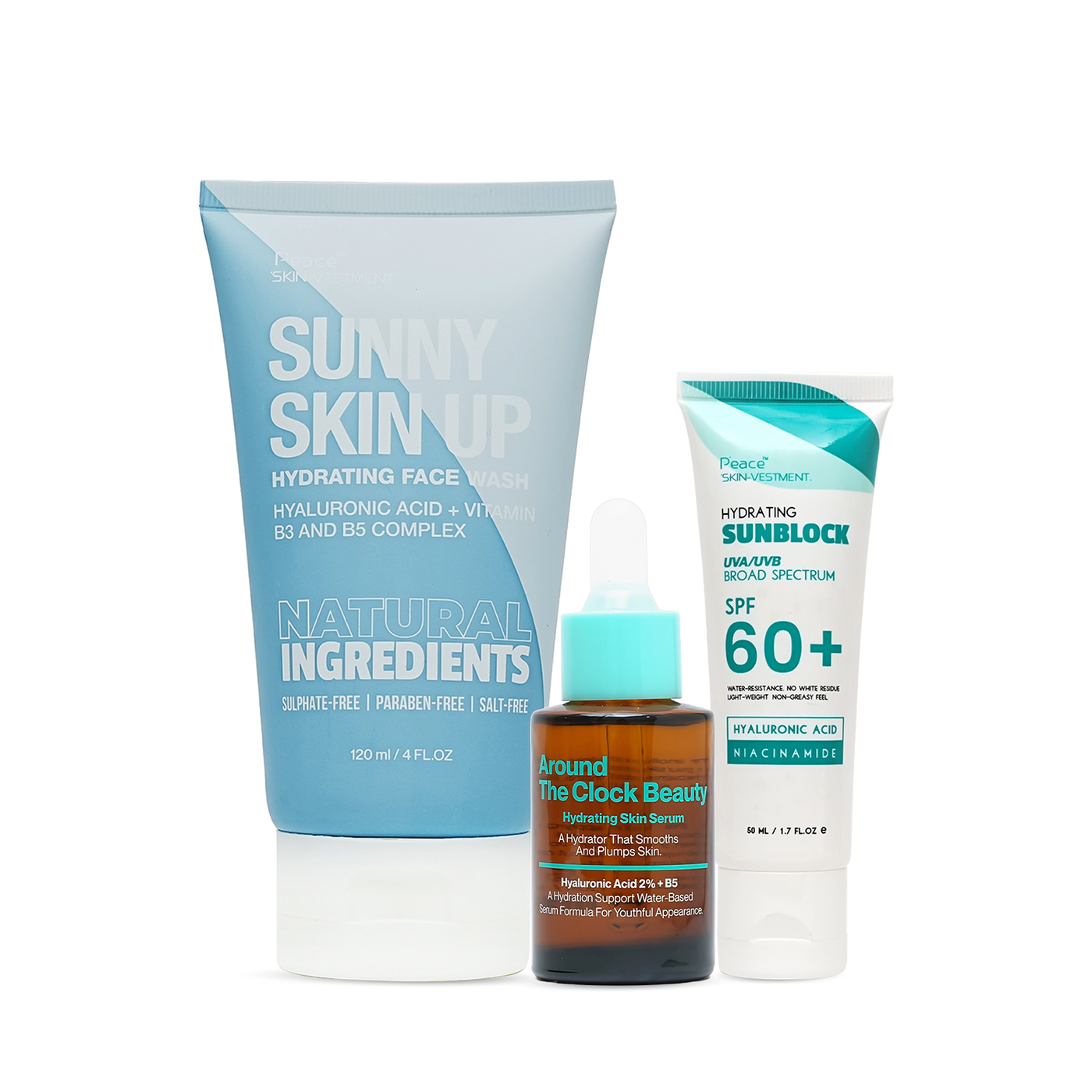 The bundle includes: a hydrating face wash (Sunny Skin Up Hydrating Face Wash), a Vitamin C serum (12 O’Clock Vitamin C Serum), and a sunblock with SPF 60. Use the face wash daily for cleansing, apply the serum on clean skin (morning and/or evening), and use the sunblock every morning (and reapply as needed) as your UV-protection step.